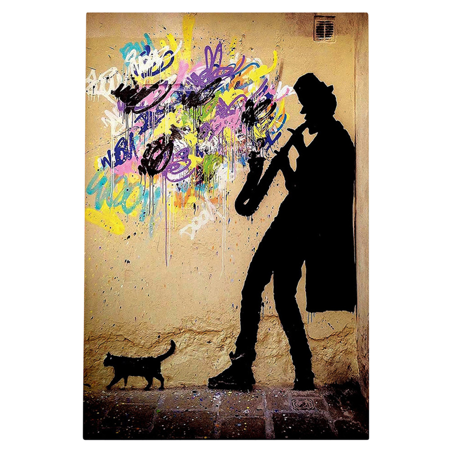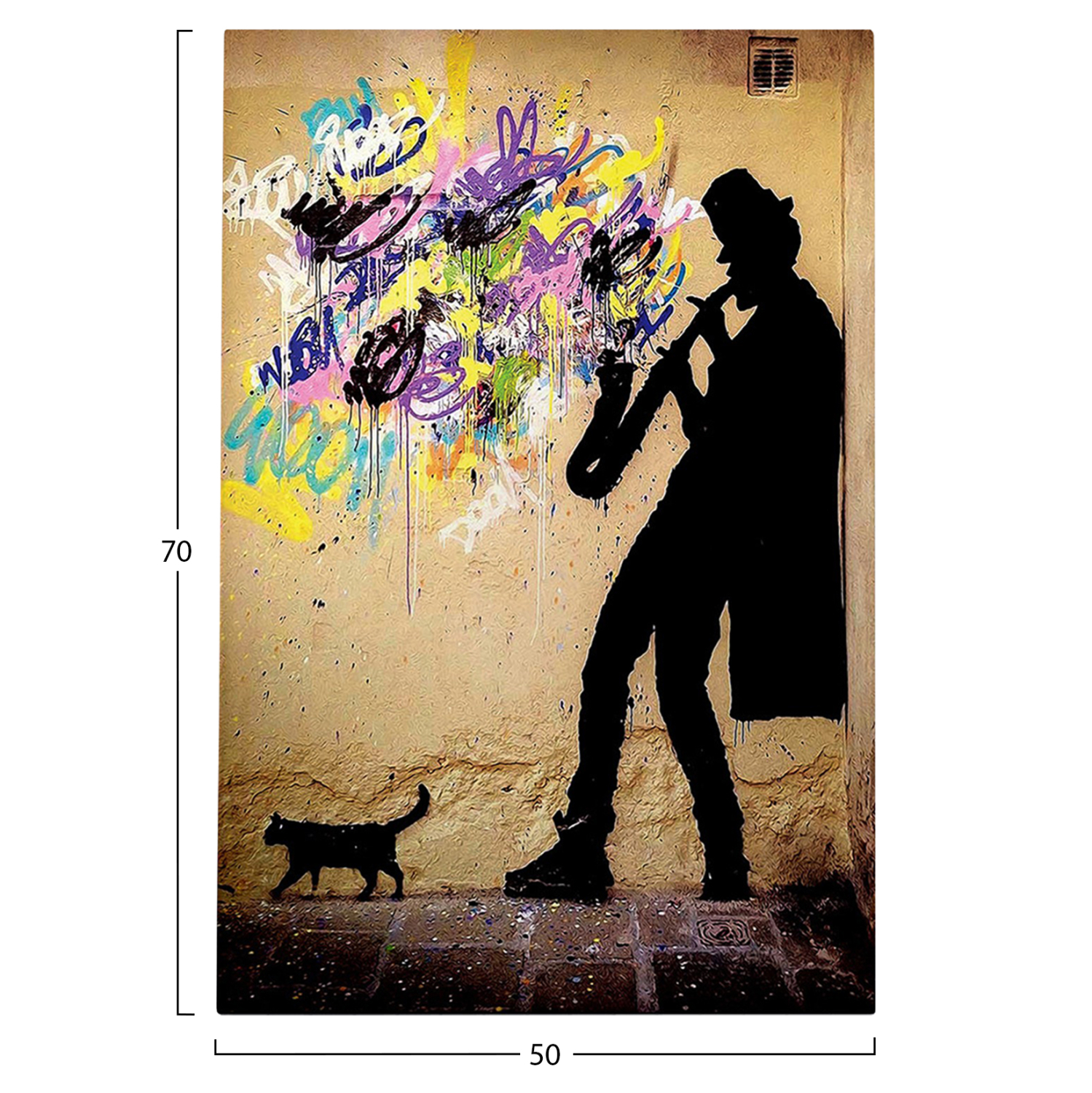 Ένας πίνακας τοίχου μεταμορφώνει τον τρόπο που αντιλαμβανόμαστε έναν χώρο. Διακοσμήστε, λοιπόν, τον χώρο σας με την καινούργια σειρά πινάκων τοίχου GOBI! Αυτός ο πολύχρωμος πίνακας που απεικονίζει την φιγούρα ενός σαξοφωνίστα σε πολύχρωμο τοίχο, έχει υλοποιηθεί σε ψηφιακά εκτυπωμένο καμβά (50% βαμβάκι-50% πολυεστέρας) σε πλαίσιο από ξύλο.