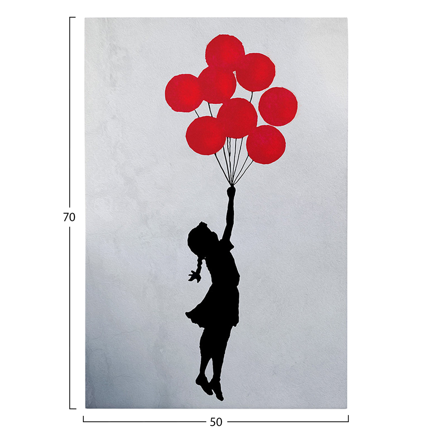 Ένας πίνακας τοίχου μεταμορφώνει τον τρόπο που αντιλαμβανόμαστε έναν χώρο. Διακοσμήστε, λοιπόν, τον χώρο σας με την καινούργια σειρά πινάκων τοίχου GOBI! Αυτός ο πίνακας που απεικονίζει ένα κορίτσι να κρατάει κόκκινα μπαλόνια (flying balloon girl), έχει υλοποιηθεί σε ψηφιακά εκτυπωμένο καμβά (50% βαμβάκι-50% πολυεστέρας) σε πλαίσιο από ξύλο.