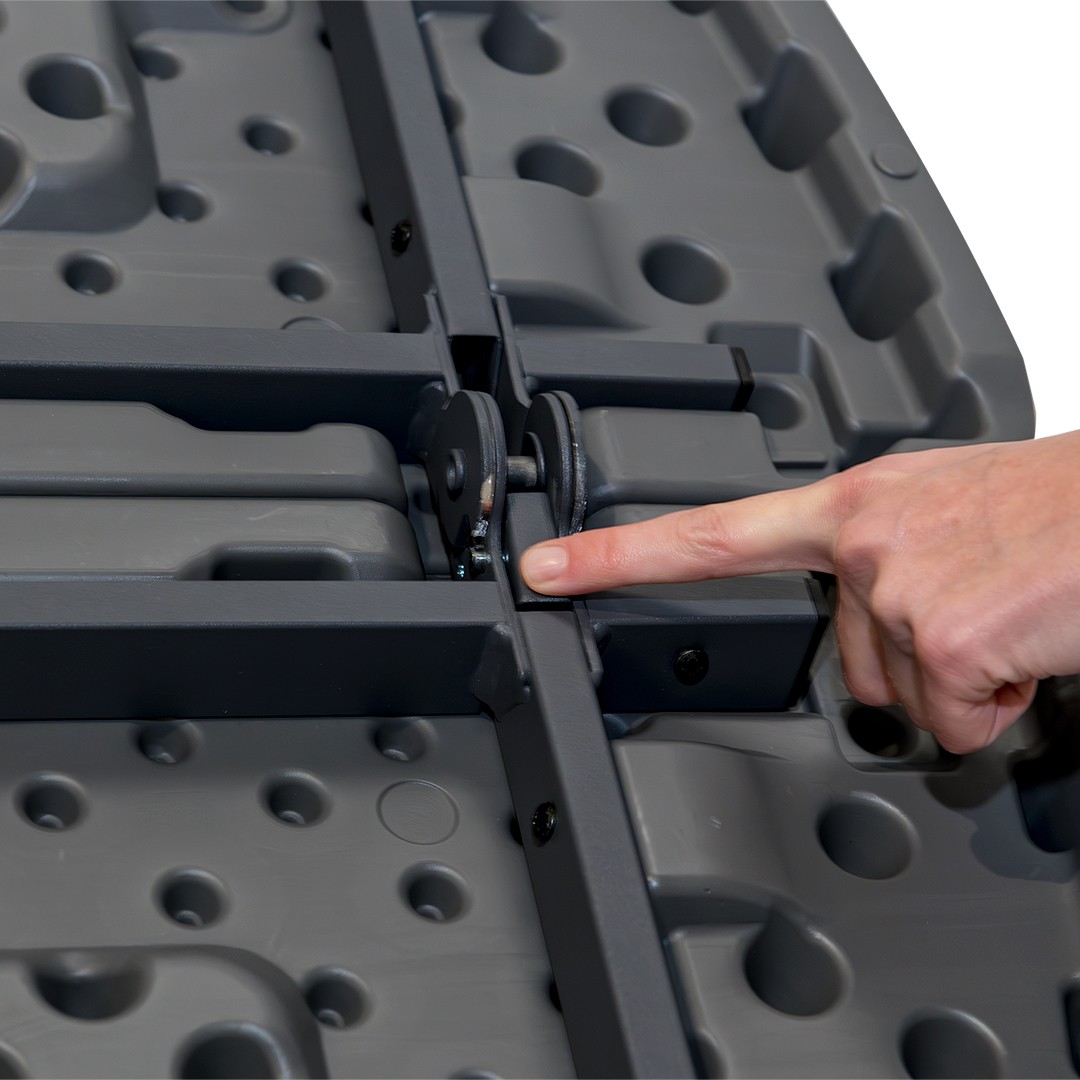 Η επιφάνειά της είναι από πολυαιθυλένιο υψηλής πυκνότητας (HDPE), ανθεκτική σε υγρασία και λεκέδες, ενώ ο ενισχυμένος μεταλλικός σκελετός με ηλεκτροστατική βαφή εξασφαλίζει άριστη σταθερότητα και διάρκεια ζωής.