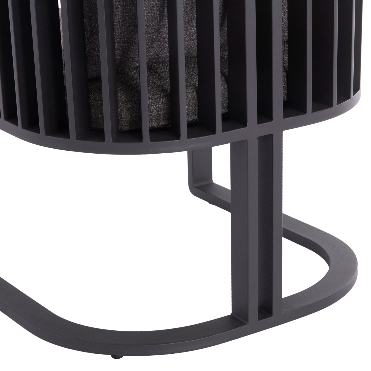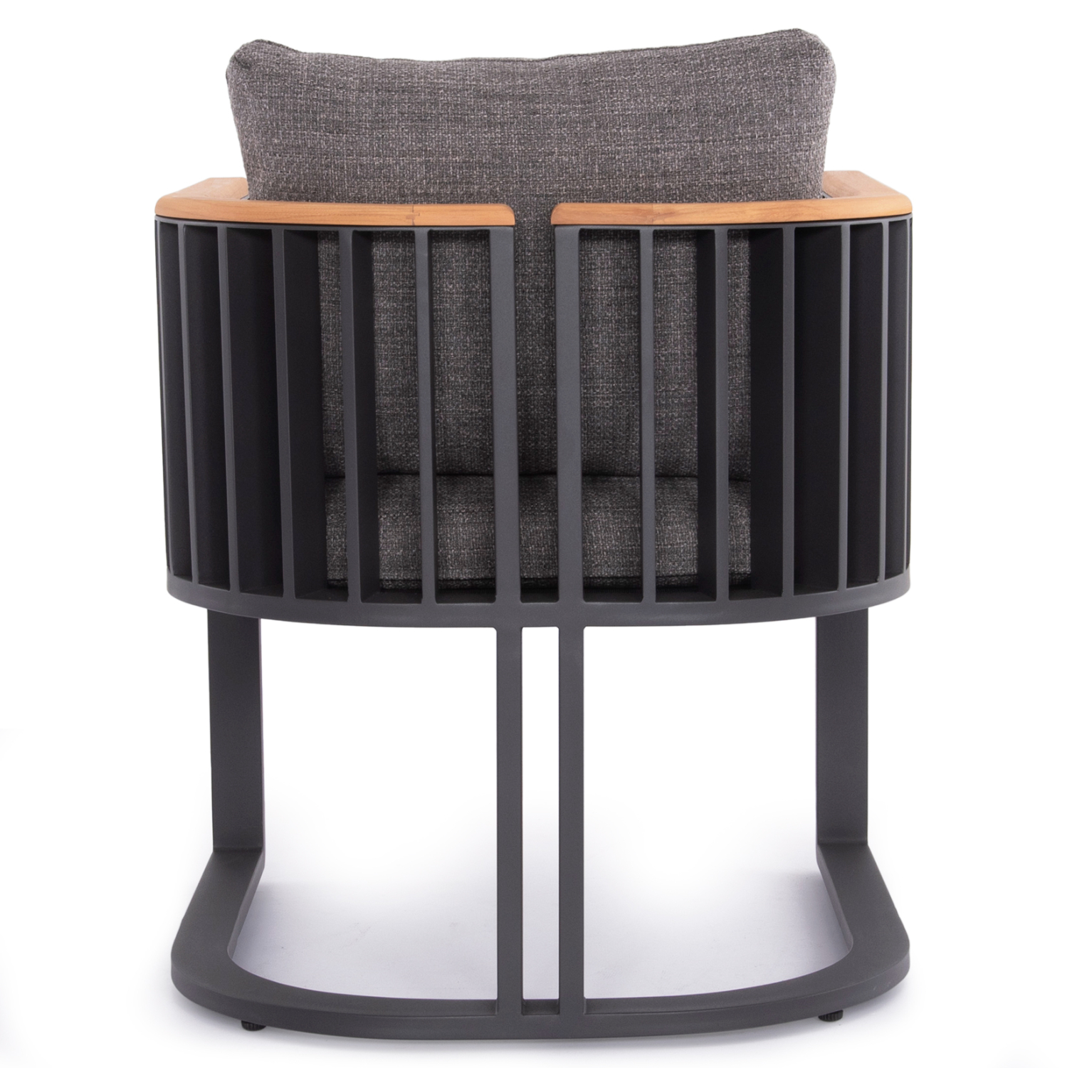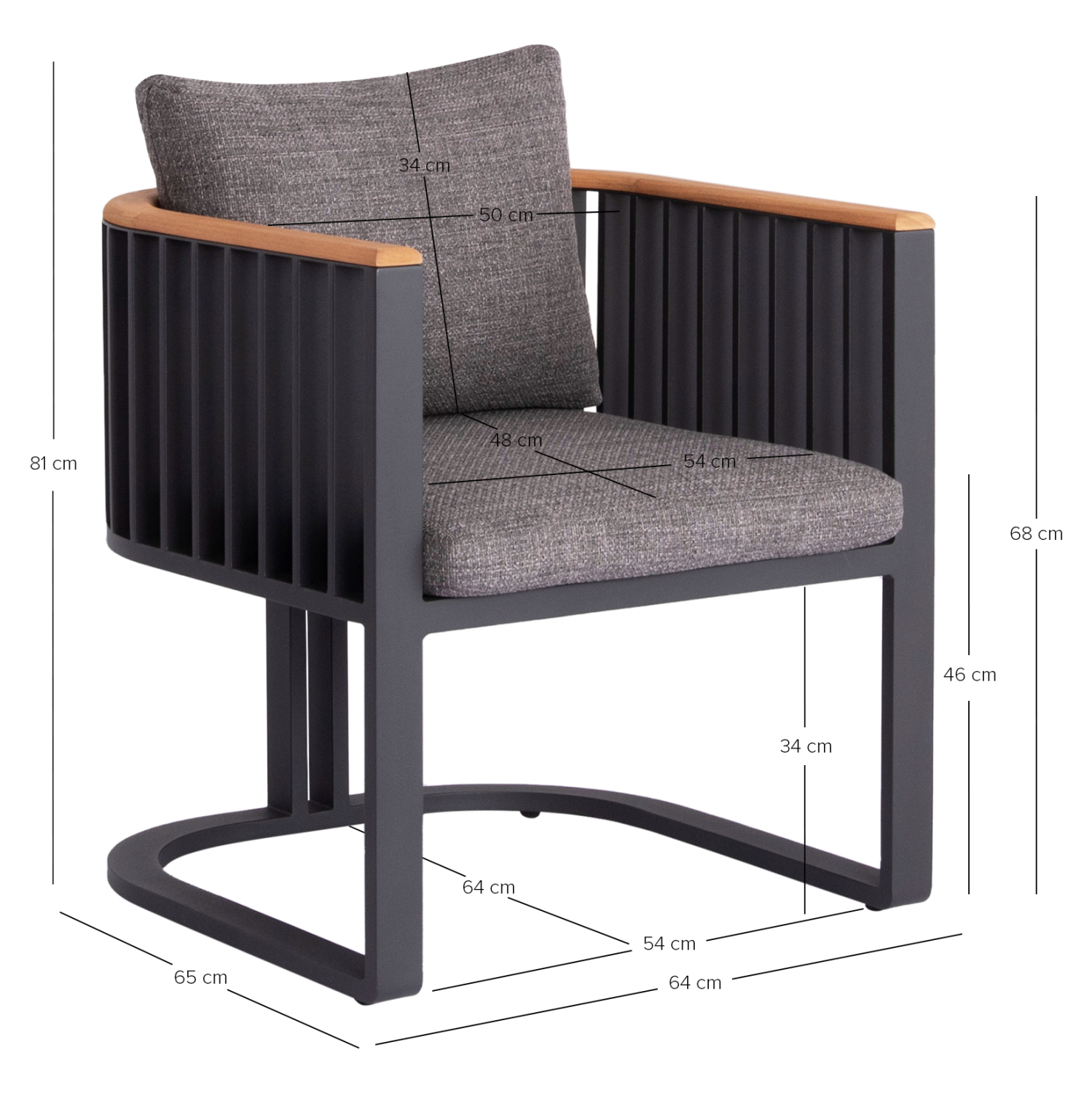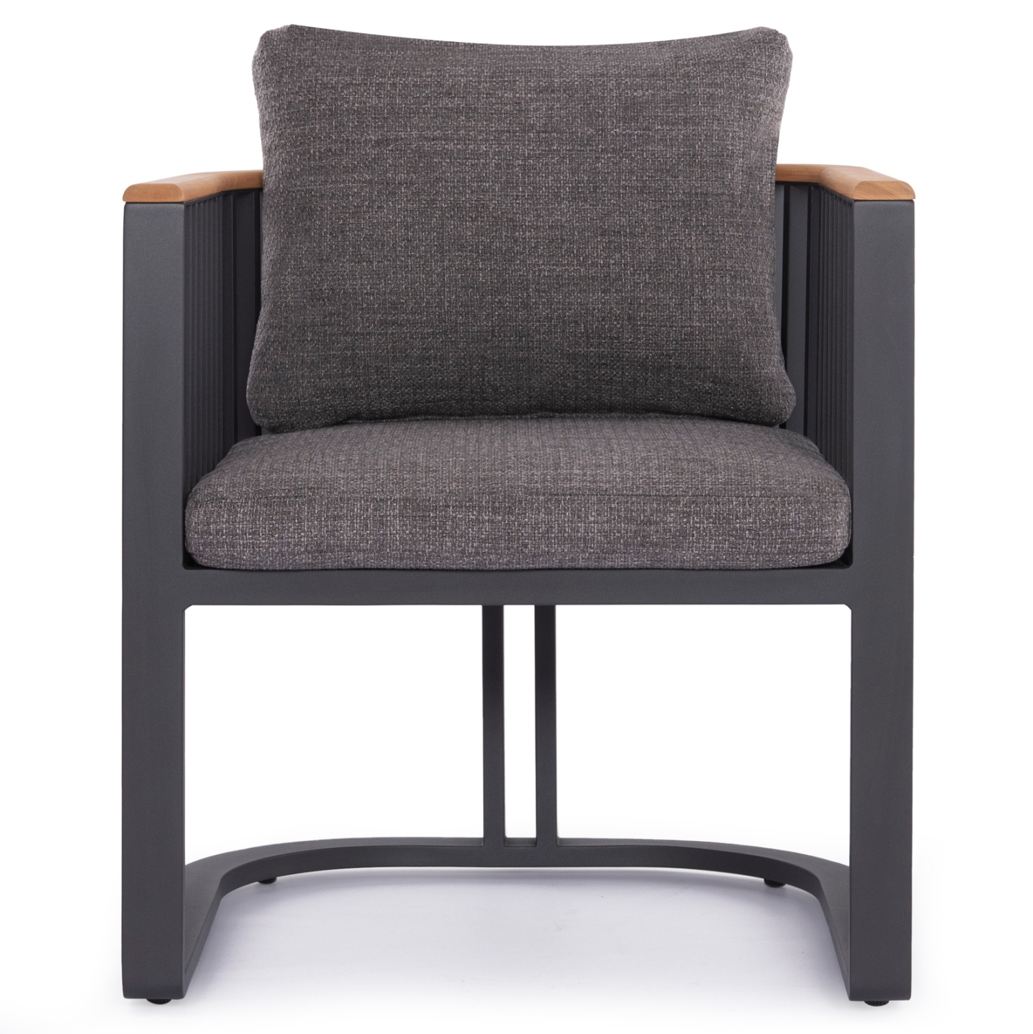 Σας παρουσιάζουμε μια καταπληκτική πολυθρόνα τραπεζαρίας εξωτερικού χώρου της σειράς ETERNITY. Μια σειρά που, μαζί με άλλες, ανεβάζει τον πήχη της ποιότητας και της αισθητικής που προσφέρουμε σε εσάς, τόσο για το σπίτι, όσο και για κάθε ανάλογο επαγγελματικό χώρο! Με απαράμιλλη ποιότητα κατασκευής και υλικών, θα αναβαθμίσει την εικόνα σε όποιο χώρο επιθυμείτε. Ο σκελετός είναι από αλουμίνιο σε ΑΝΘΡΑΚΙ χρώμα και τα μαξιλάρια είναι σε χρώμα ΑΝΟΙΧΤΟ ΓΚΡΙ. Η επένδυση στα μπράτσα με ξύλο teak είναι άλλη μία πινελιά πολυτέλειας σε αυτή την μοναδική πολυθρόνα, η οποία ξεχωρίζει και για τον όμορφο σχεδιασμό της βάσης της.