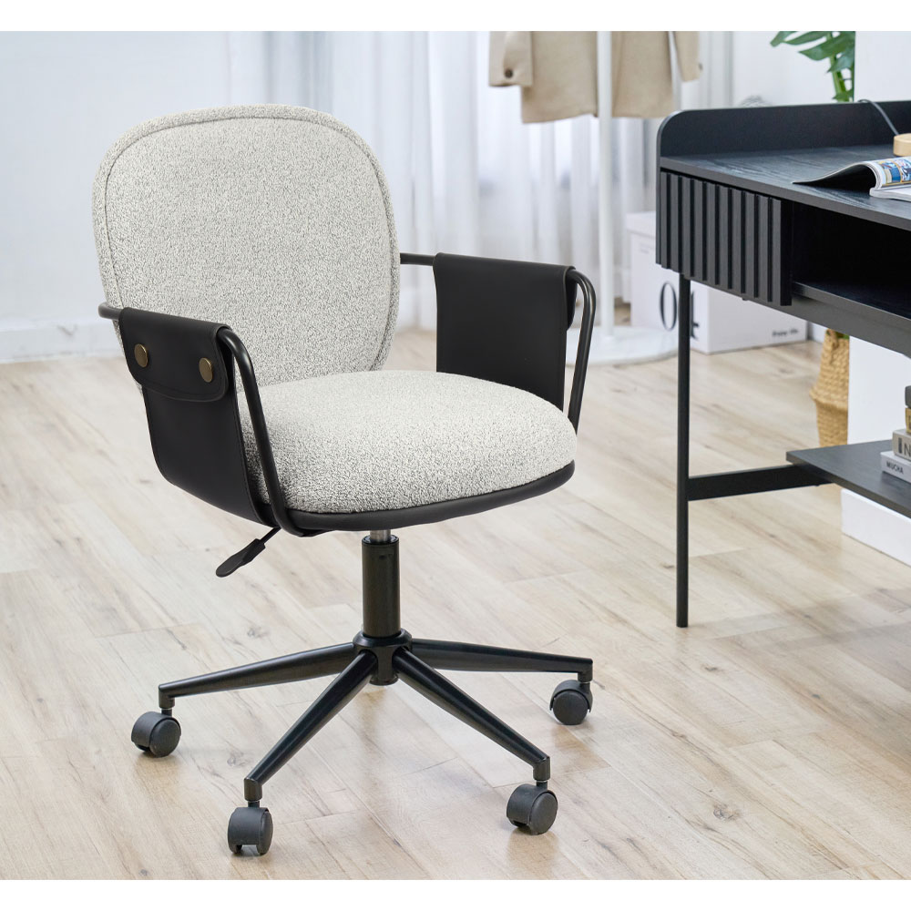 Η καρέκλα γραφείου Post συνδυάζει κομψότητα, άνεση και λειτουργικότητα, καθιστώντας την ιδανική επιλογή για έναν σύγχρονο χώρο εργασίας. Το κάθισμα και η πλάτη είναι επενδυμένα με μπουκλέ ύφασμα σε γκρι απόχρωση, χαρίζοντας μια ζεστή και φιλόξενη αίσθηση. Τα μπράτσα είναι επενδυμένα με μαύρη δερματίνη, προσδίδοντας μια διακριτική αίσθηση πολυτέλειας και μοντέρνας αισθητικής.Η μεταλλική βάση σε μαύρη απόχρωση εξασφαλίζει σταθερότητα και αντοχή, ενώ το σύνολο αναδεικνύει μια διαχρονική αλλά και μοντέρνα αισθητική.Η Post αποτελεί την τέλεια επιλογή για όσους αναζητούν μια καρέκλα γραφείου που συνδυάζει στυλ και πρακτικότητα.