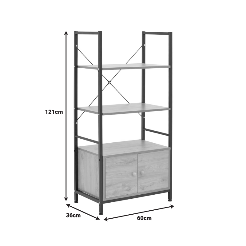 - Διαθέτει τρία ευρύχωρα ράφια και ένα ντουλάπι ιδανικά για την αποθήκευση φούρνου μικροκυμάτων, τοστιέρας, συσκευών κουζίνας, βάζων και σκευών.