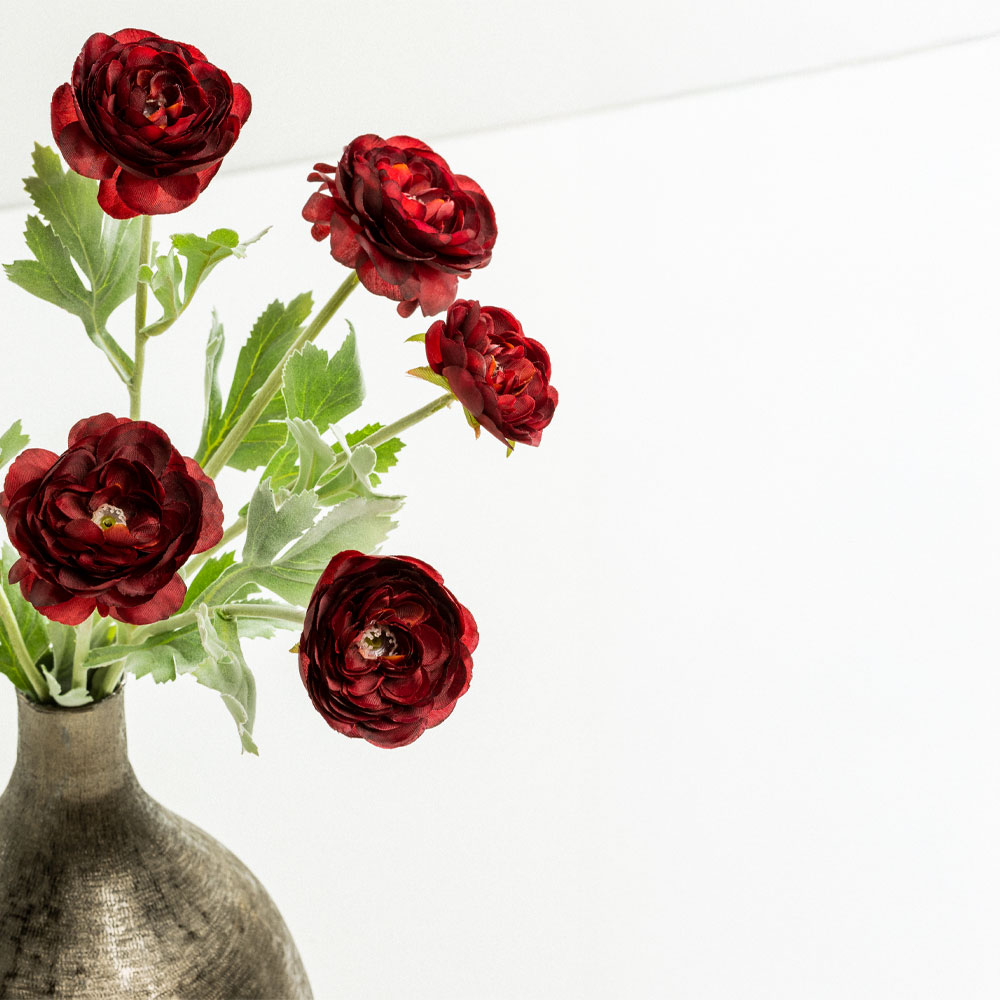 Το RANUNCULUS 51cm σε βαθιά μπορντώ απόχρωση προσδίδει έναν αέρα μυστηρίου, πολυτέλειας και θεατρικής κομψότητας. Ένα εντυπωσιακό διακοσμητικό που λειτουργεί σαν statement κομμάτι – είτε μόνο του είτε μέσα σε πιο σκοτεινές, σοφιστικέ ανθοσυνθέσεις. Ιδανικό για βραδινή ατμόσφαιρα, σαλόνια με χαρακτήρα ή επαγγελματικούς χώρους με ταυτότητα.