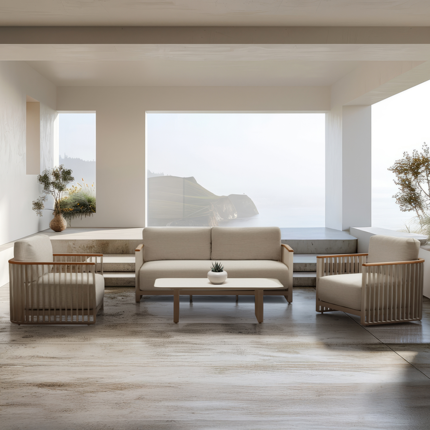 Σας παρουσιάζουμε το εξαιρετικό σετ σαλόνι 4τμχ εξωτερικού χώρου της σειράς ETERNITY. Μια σειρά που, μαζί με άλλες, ανεβάζει τον πήχη της ποιότητας και της αισθητικής που προσφέρουμε σε εσάς, τόσο για το σπίτι, όσο και για κάθε ανάλογο επαγγελματικό χώρο! Με απαράμιλλη ποιότητα κατασκευής και υλικών, θα αναβαθμίσει την εικόνα σε όποιο χώρο επιθυμείτε. Αποτελείται από 2-θέσιο καναπέ, 2 πολυθρόνες και ένα τραπεζάκι. Ο σκελετός είναι από αλουμίνιο σε IVORY (κρεμ) χρώμα με μαξιλάρια σε χρώμα ΜΠΕΖ. Η επένδυση στα μπράτσα με ξύλο teak είναι άλλη μία πινελιά πολυτέλειας σε όλο το σετ, ενώ το top στο τραπεζάκι από sintered stone σε πιο ανοιχτό χρωματισμό απογειώνει ποιοτικά όλη την σύνθεση!