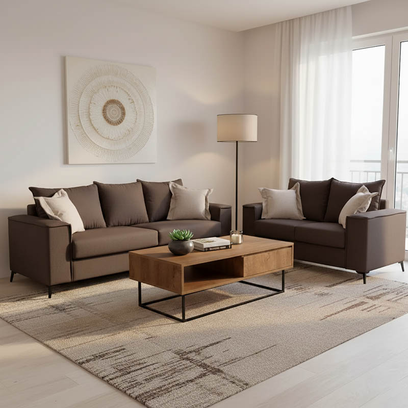 σε μπεζ χρώμα στον διθέσιο και δύο στον τριθέσιο καναπέ.