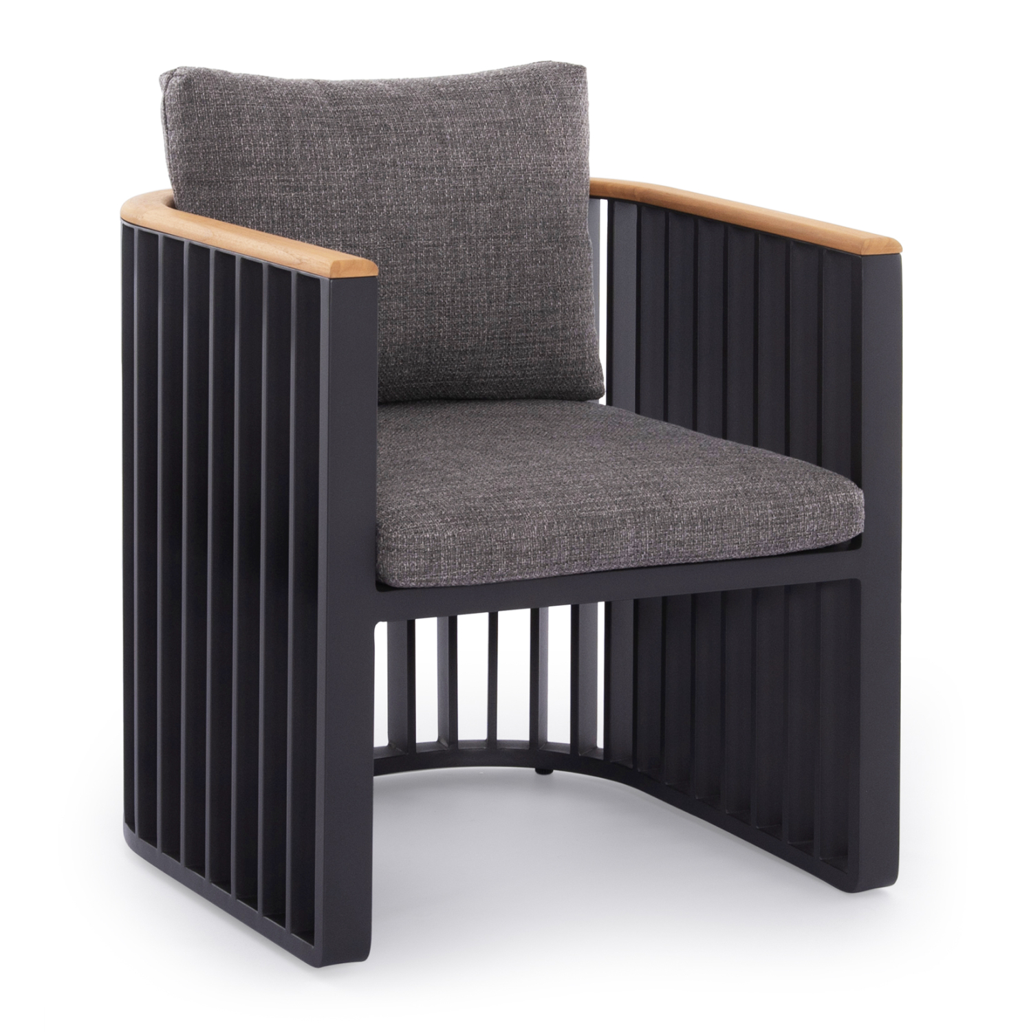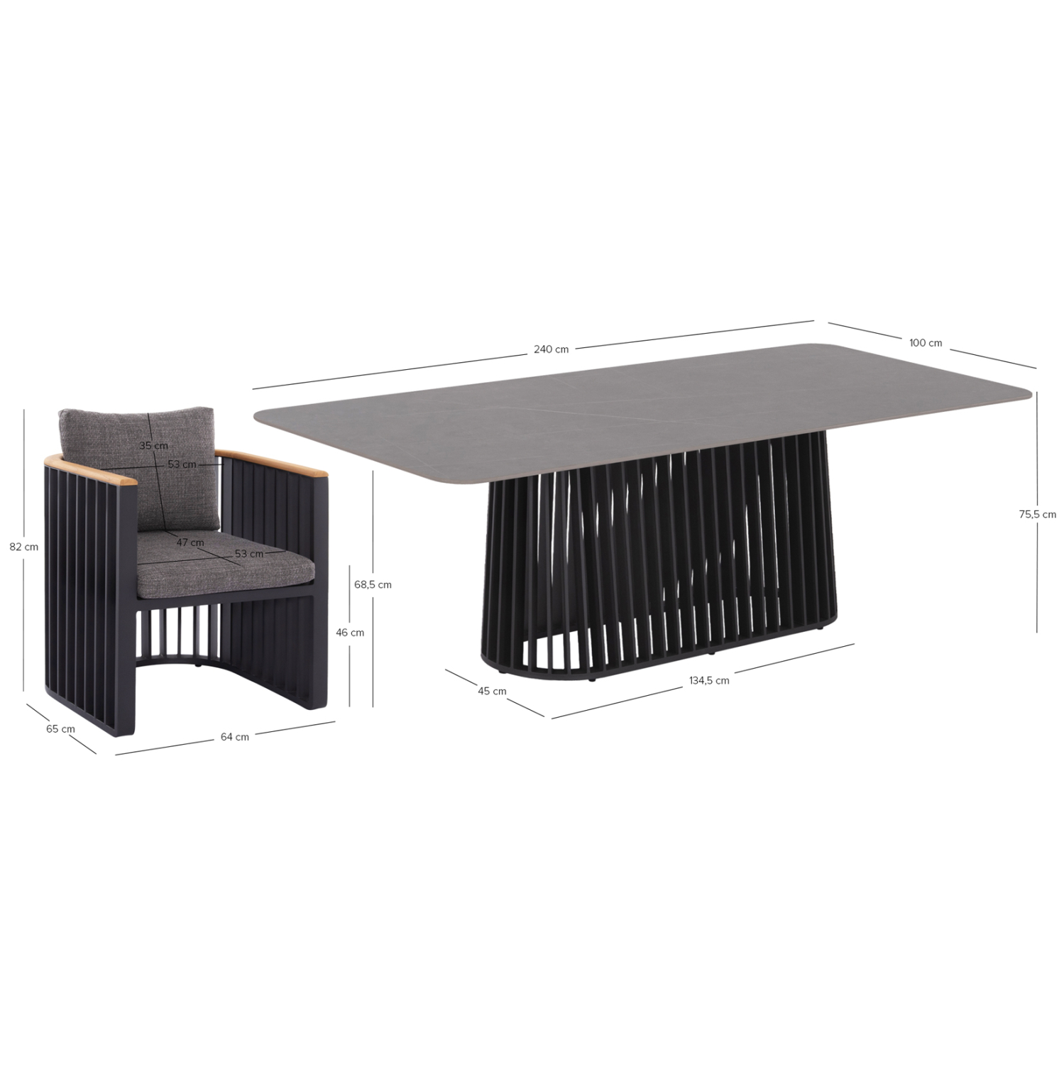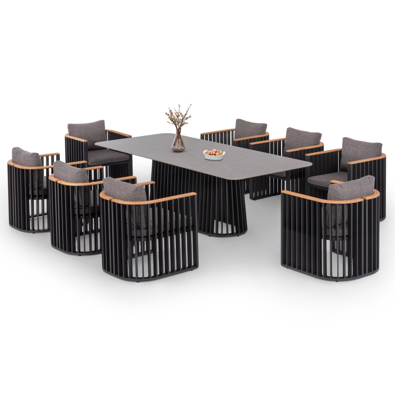 Σας παρουσιάζουμε ένα εντυπωσιακό σετ τραπεζαρίας εξωτερικού χώρου της σειράς ETERNITY σε ΣΚΟΥΡΟ ΓΚΡΙ (ανθρακί) χρώμα. Η σειρά ETERNITY, μαζί με τις άλλες νέες σειρές του SYMETRON, ανεβάζει τον πήχη της ποιότητας και της αισθητικής που προσφέρουμε σε εσάς, τόσο για το σπίτι, όσο και για κάθε ανάλογο επαγγελματικό χώρο! Με απαράμιλλη ποιότητα κατασκευής και υλικών, θα αναβαθμίσει την εικόνα σε όποιο χώρο επιθυμείτε. Το σετ αποτελείται από ένα μεγάλο ορθογώνιο τραπέζι με βάση αλουμινίου και επιφάνεια από SINTERED STONE σε χρωματισμό σκούρου γκρι μαρμάρου, και 8 πολυθρόνες παρόμοιας αισθητικής με μαξιλάρια καθίσματος και πλάτης, με μια «πινελιά» ξύλου teak στα μπράτσα!