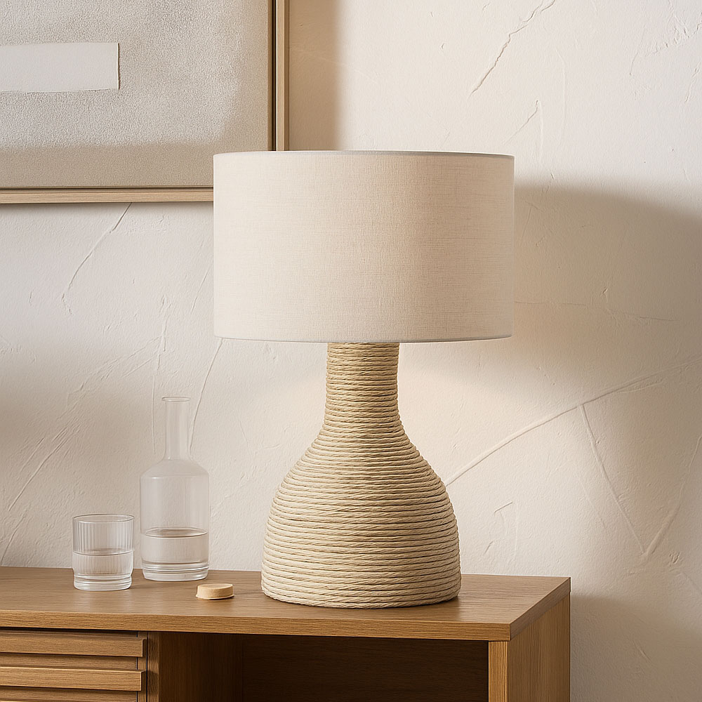 Το SIKINOS είναι ένα επιτραπέζιο φωτιστικό σε φυσική απόχρωση, με βάση από σχοινί και ύφασμα, που προσφέρει ζεστή και οργανική αισθητική. Η μπεζ παλέτα του ταιριάζει ιδανικά σε boho, coastal και rustic χώρους. Προσφέρει απαλό, ευχάριστο φωτισμό που δημιουργεί cozy ατμόσφαιρα. Ένα φωτιστικό που ενισχύει την αίσθηση φυσικότητας στη διακόσμηση.