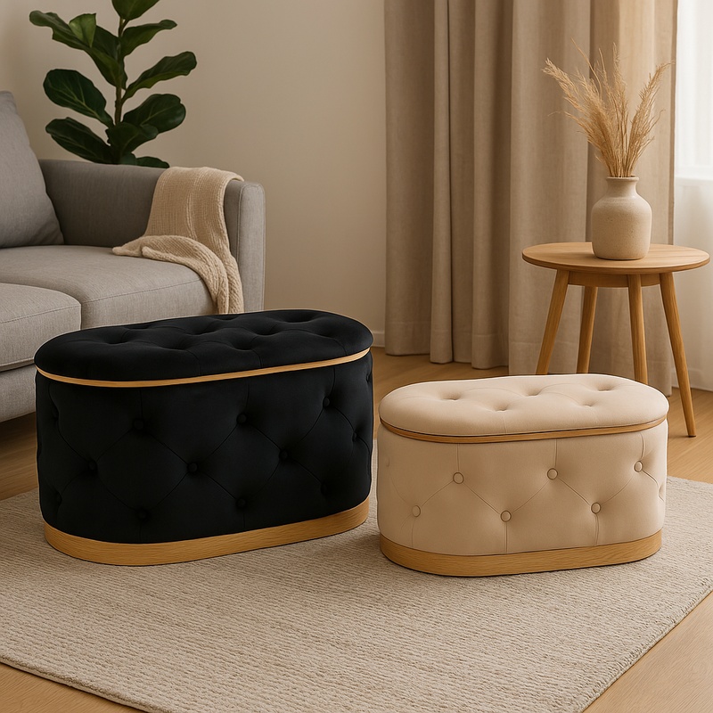 Σκαμπό μπαούλο Royel Inart σετ 2 τεμ βελούδο σε μαύρη και μπεζ απόχρωση