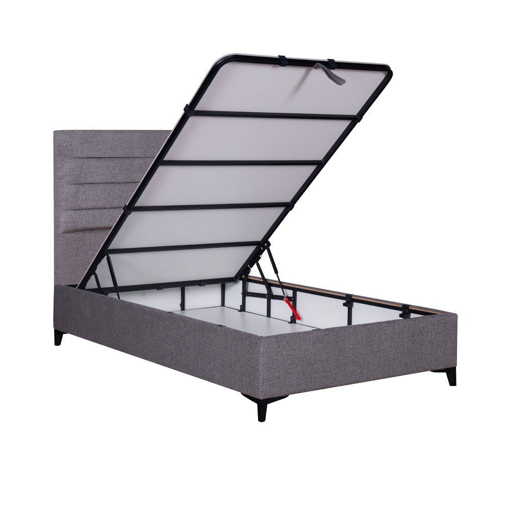 Κρεβάτι με αποθηκευτικό χώρο! Διαθέτει αεριζόμενο, αντιμικροβιακό, ευρύχωρο αποθηκευτικό χώρο και 4 αμορτισέρ ασφαλείας διπλής ενέργειας, που ανασηκώνουν εύκολα το στρώμα. Ειδική σχεδίαση και κατασκευή του κρεβατιού για απόλυτη απουσία τριγμών. Μεταλλικός σκελετός ηλεκτροστατικής βαφής, εξαιρετικής αντοχής, αντικραδασμικός. Πλαϊνά από οικολογική μελαμίνη, επενδυμένα με αφρώδες υλικό & ύφασμα . Απόλυτα επίπεδη και ενιαία επιφάνεια, ιδανική για κάθε τύπο στρώματος .Η επιφάνεια του υποστρώματος είναι καλυμμένη με αντιολισθητικό ύφασμα για την καλύτερη συγκράτηση του στρώματος. Ο πάτος είναι από μελαμίνη πάχους 8mm και φέρει αεραγωγούς. Ψηλά ποδαράκια για εύκολο καθάρισμα.