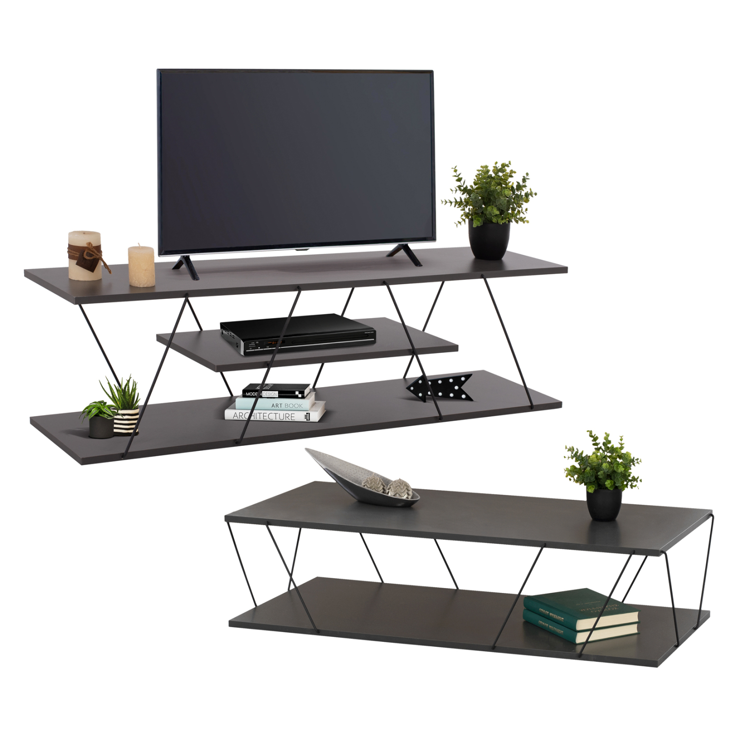 Η σύνθεση TARS θα αλλάξει την όψη στο σαλόνι σας και θα σας προσφέρει την αναβάθμιση που θέλετε. Αποτελείται από έναν συνδυασμό επίπλων για την τηλεόρασή σας με μονάδα δαπέδου και ένα τραπεζάκι σαλονιού. Όλη η σύνθεση είναι της ίδιας σειράς από μελαμίνη σε χρώμα σκούρο γκρι και μεταλλικές ράβδους σε μαύρο χρώμα.