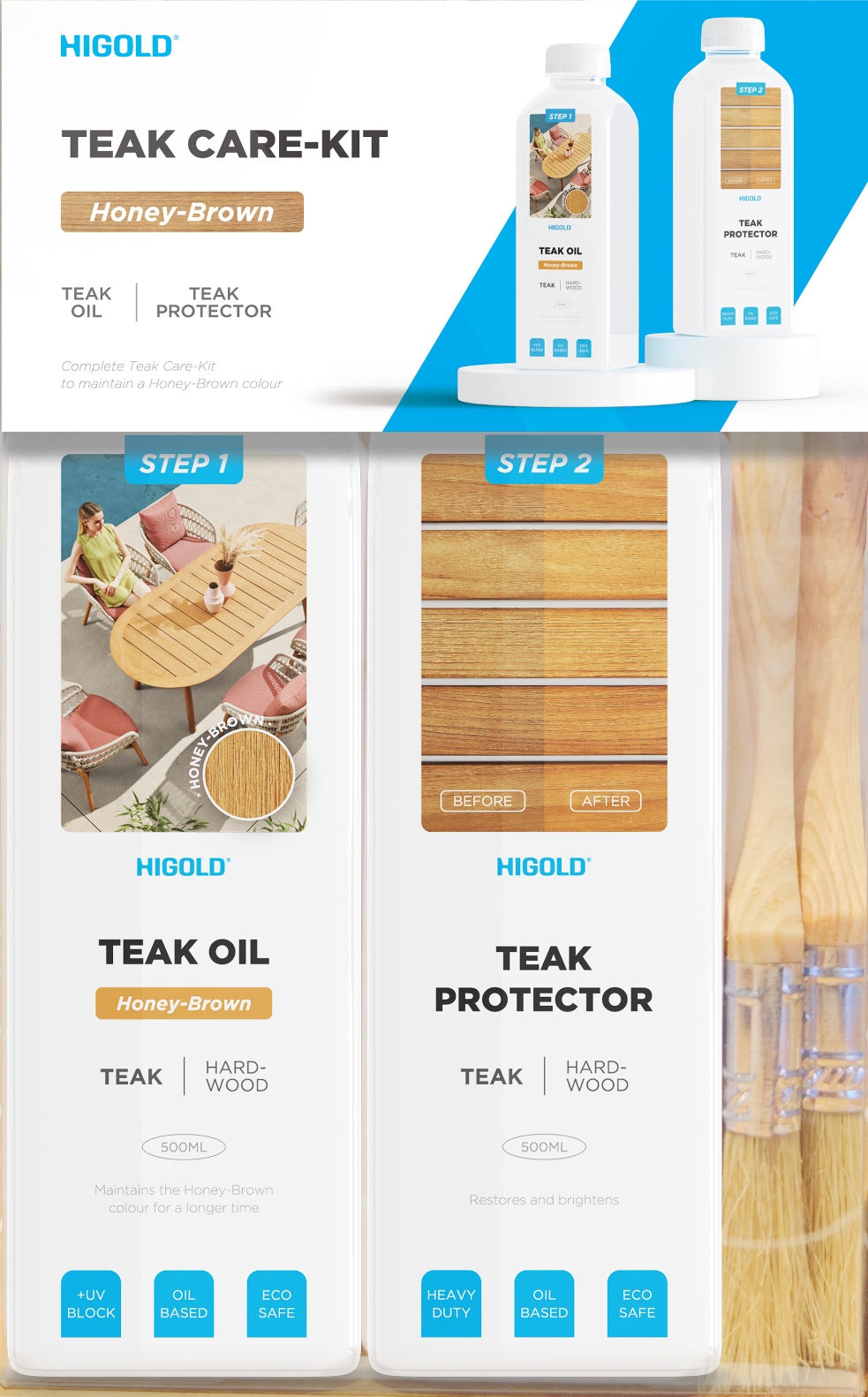 Λάδι προστασίας-συντήρησης για ξύλο teak σε μελί-καφέ απόχρωση. Κατάλληλο για τα HIGOLD sets Vasca/Pallisad/Riva.