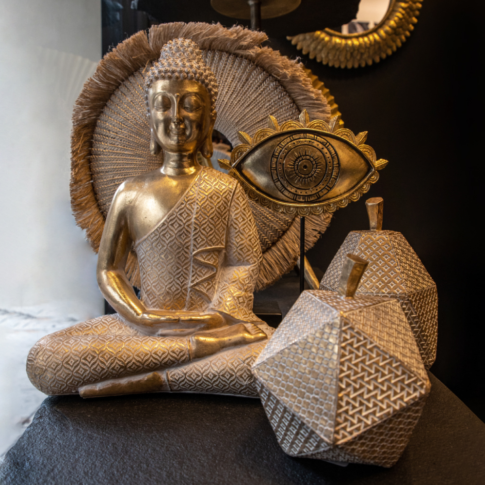 Το διακοσμητικό THE EYE Totem από πολυρεζίνη σε χρυσό και μαύρο, με διαστάσεις 19x7x30cm, είναι ένα εντυπωσιακό αντικείμενο με συμβολικό χαρακτήρα. Εμπνευσμένο από το αρχέτυπο του ματιού-προστάτη, αποτελεί statement κομμάτι για κάθε μοντέρνο ή μποέμ χώρο. Η μεταλλική βάση του προσδίδει σταθερότητα και ανάδειξη, καθιστώντας το ιδανικό για τοποθέτηση σε κονσόλες, ράφια ή επιτραπέζιες επιφάνειες.