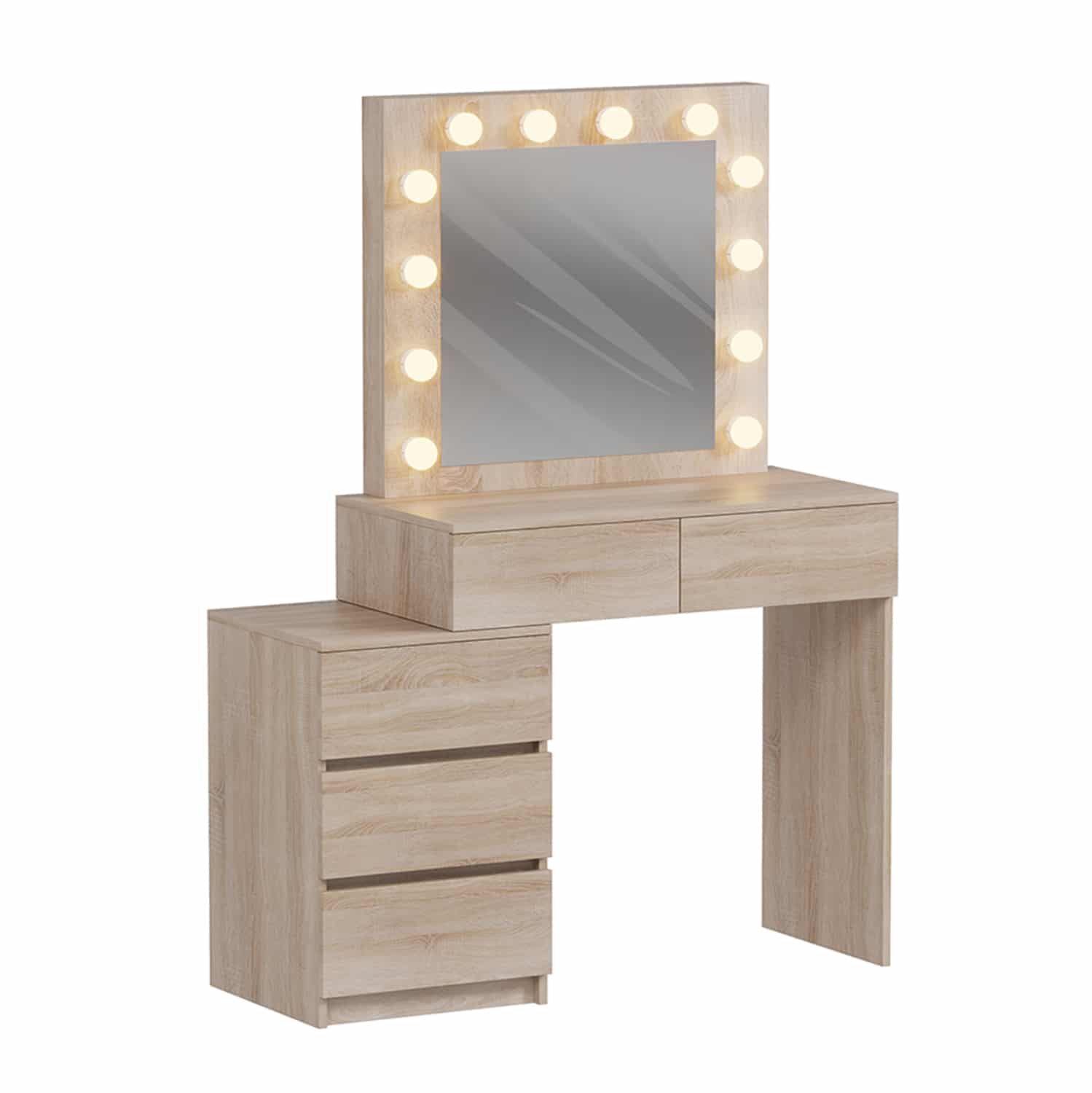 Η τουαλέτα BEYON είναι άλλη μια καινούργια προσθήκη στην γκάμα μας. Πρόκειται για ένα πρακτικότατο έπιπλο σε χρώμα SONAMA που θα αλλάξει την εικόνα του χώρου σας. Αποτελείται από ένα τραπέζι με καθρέπτη και 5 συρτάρια. 2 συρτάρια μακρόστενα κάτω από την επιφάνεια, κι άλλα 3 μεγαλύτερα στην αριστερή πλευρά σαν συρταριέρα. Αυτή η συρταριέρα είναι κινητή, και επιτρέπει το υπόλοιπο έπιπλο να “πατάει” επάνω της και στην ουσία να μεγαλώνει τον χώρο στο κάτω μέρος, αλλά και να δημιουργεί ακόμα μία επιφάνεια τοποθέτησης αντικειμένων! Αυτό όμως που κερδίζει τις εντυπώσεις είναι ότι ο καθρέπτης συνοδεύεται από φώτα LED περιμετρικά, απογειώνοντας την χρησιμότητα του επίπλου.