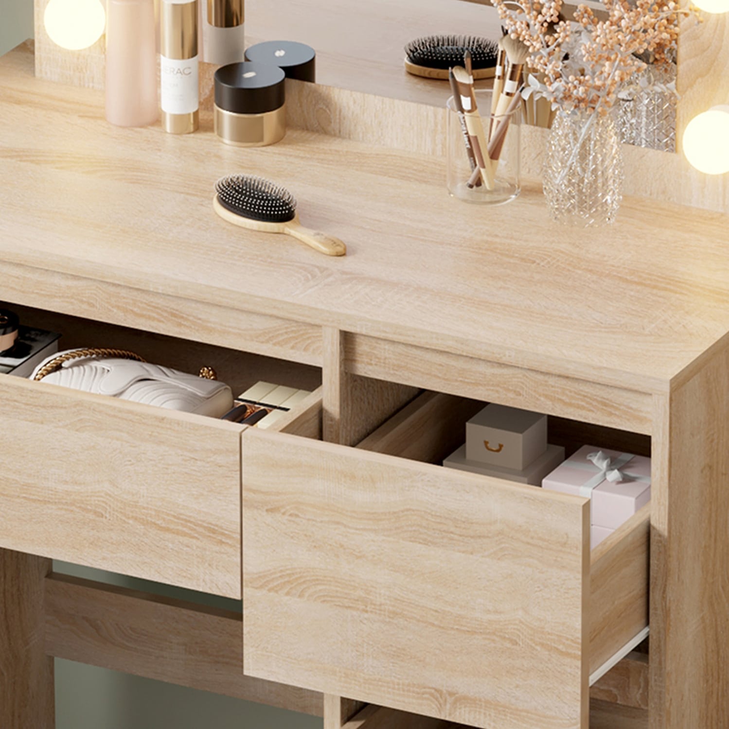 Η τουαλέτα KEITLIN είναι άλλη μια καινούργια προσθήκη στην γκάμα μας. Πρόκειται για ένα πρακτικότατο σύνολο που θα αλλάξει την εικόνα του χώρου σας. Αποτελείται από ένα τραπέζι με 4 συρτάρια. Ένα συρτάρι μακρόστενο κάτω από την επιφάνεια, κι άλλα 3 μεγαλύτερα στην δεξιά πλευρά. Αυτό όμως που κερδίζει τις εντυπώσεις είναι ότι ο καθρέπτης συνοδεύεται από φώτα LED περιμετρικά, απογειώνοντας την χρησιμότητα του επίπλου.