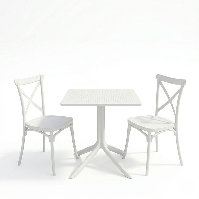 Η παράδοση συναντά το σήμερα. Το σετ παντρεύει την κλασική “χιαστί” πλάτη της καρέκλας Crossie με τον industrial διάτρητο σχεδιασμό του τραπεζιού Groovy. Ένα total white σύνολο που μεταμορφώνει το μπαλκόνι ή τον κήπο σας σε ένα γραφικό bistro, προσφέροντας απόλυτη αντοχή στις καιρικές συνθήκες.
