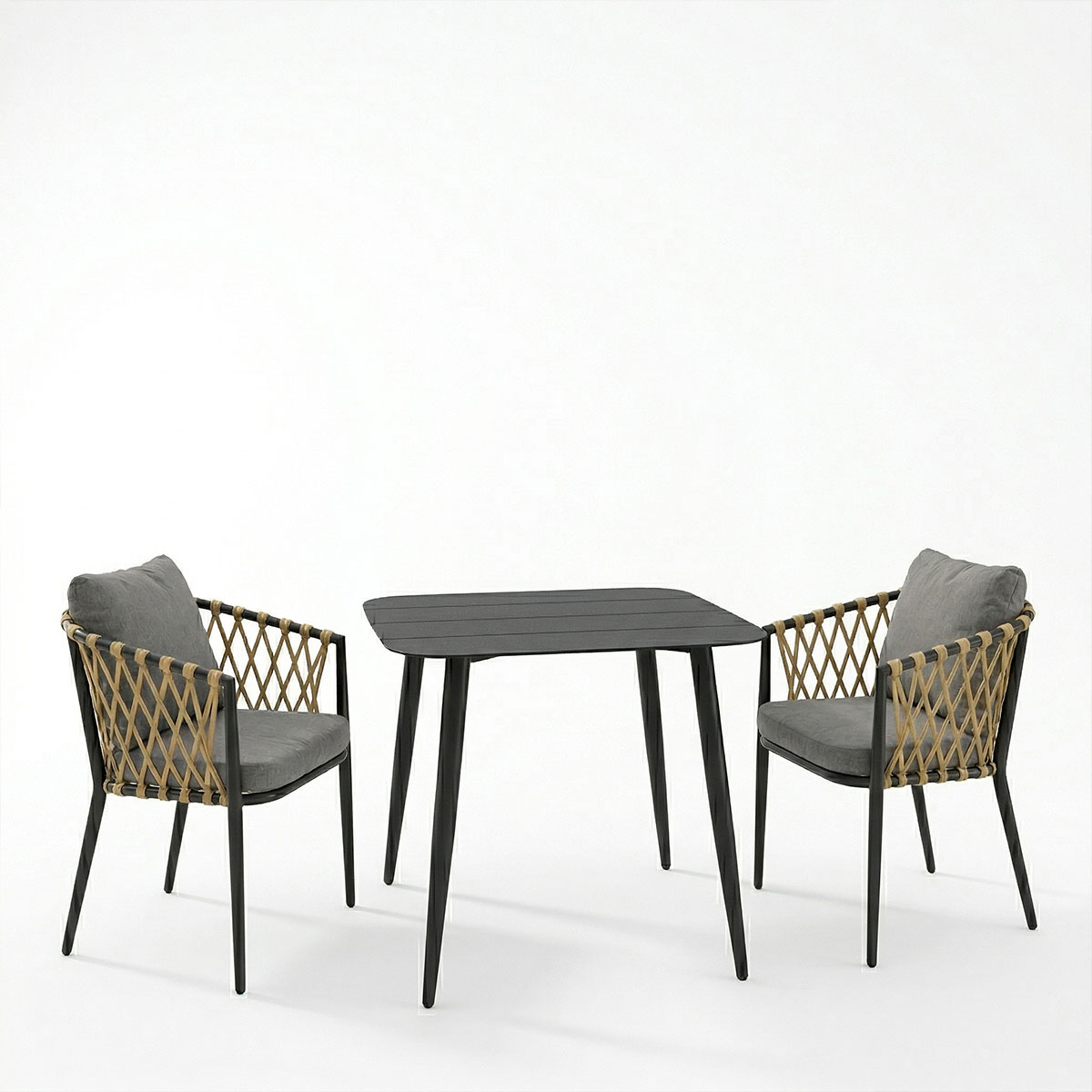 Τραπεζαρία Peluxe Vista σετ 3τεμ ανθρακί αλουμίνιο με PE σχοινί σε φυσική απόχρωση και μαξιλάρια 80x80x72εκ