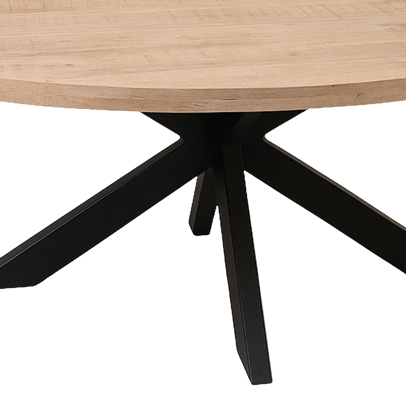 - Μοναδικός Σχεδιασμός: Η οβάλ επιφάνεια από μασίφ ξύλο, με το εντυπωσιακό ακτινωτό μοτίβο, προσδίδει μια αίσθηση ζεστασιάς και εκλεπτυσμένης ρουστίκ κομψότητας. Κάθε τραπέζι είναι μοναδικό, με τους φυσικούς κόκκους του ξύλου να αφηγούνται τη δική τους ιστορία.