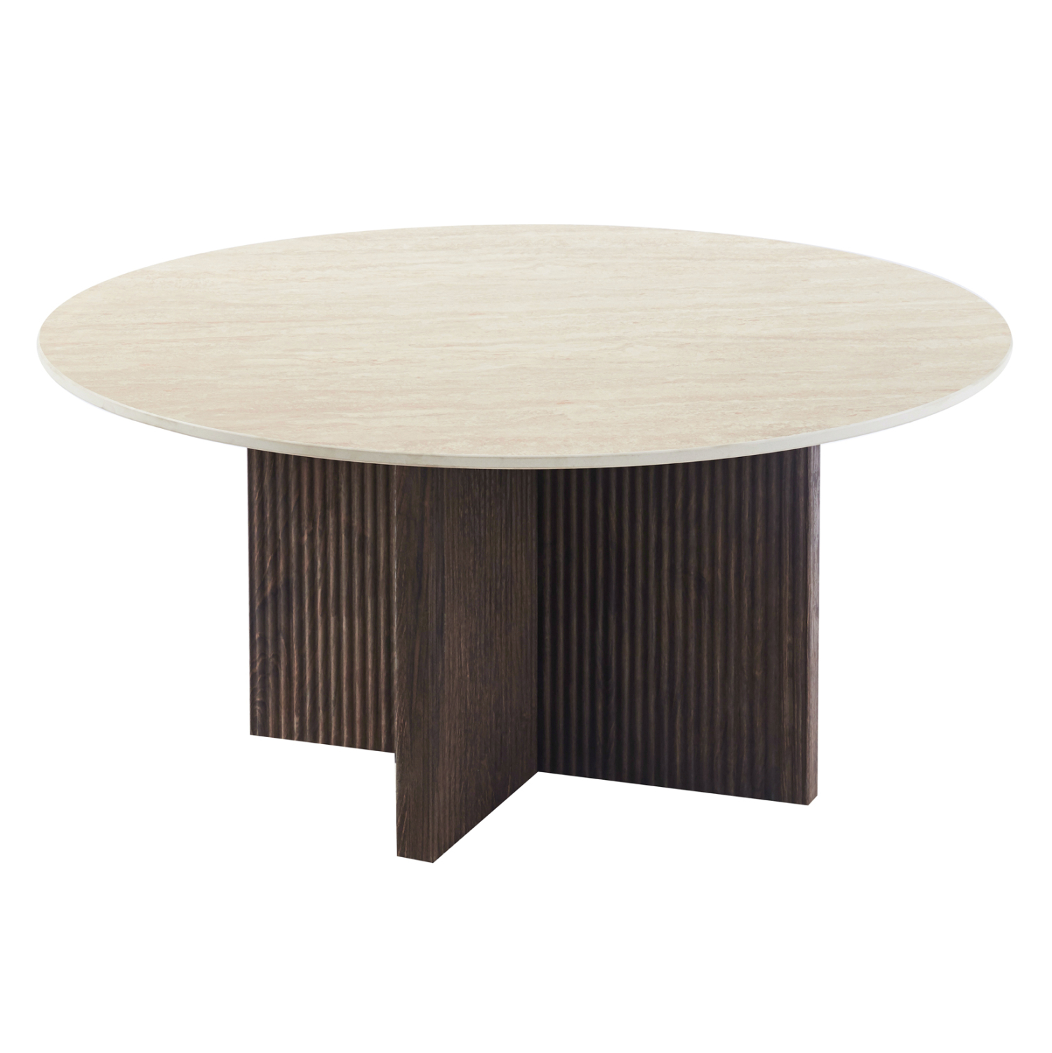 Το τραπέζι σαλονιού SKY είναι στρογγυλό και αποτελεί νέα προσθήκη στην γκάμα μας. Η επίπεδη επιφάνειά του είναι κεραμική σε χρωματισμό TRAVERTINE STONE, ενώ η βάση του είναι σταυρωτή κατασκευασμένη εξολοκλήρου από MDF σε καφέ χρώμα, με όμορφες πτυχώσεις.
