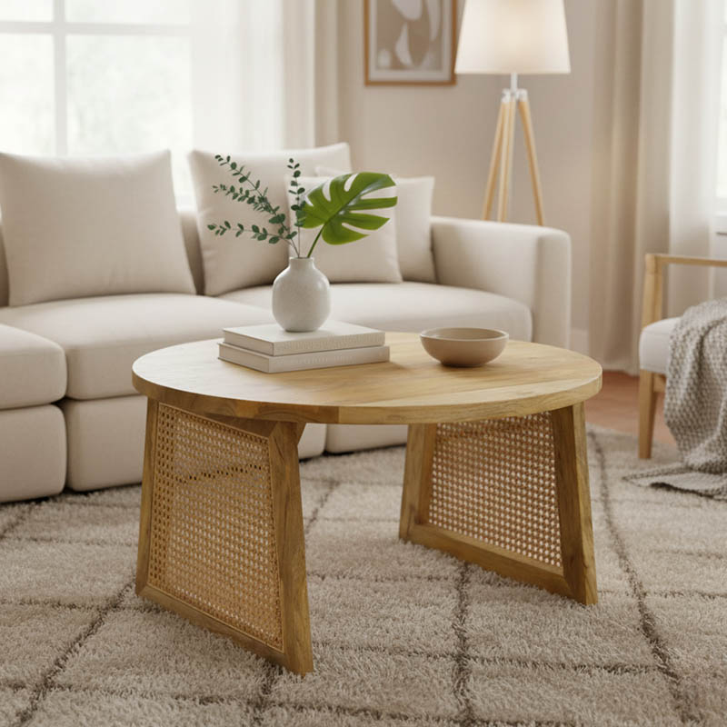Το FRANTZ είναι ένα στρογγυλό τραπέζι για το σαλόνι, με σχετικά μεγάλες διαστάσεις στο φυσικό χρώμα του ξύλου του. Το τραπέζι στηρίζεται σε μια ξύλινη κατασκευή στο κέντρο με πολλές δοκούς σε κυκλική διάταξη που ενώνονται μεταξύ τους με μια βάση στο πάτωμα. Αυτό το τραπέζι θα αναβαθμίσει αισθητικά το σαλόνι σας ενώ μπορεί να ταιριάξει με πολλά διαφορετικά στυλ και χρώματα στον τριγύρω χώρο.