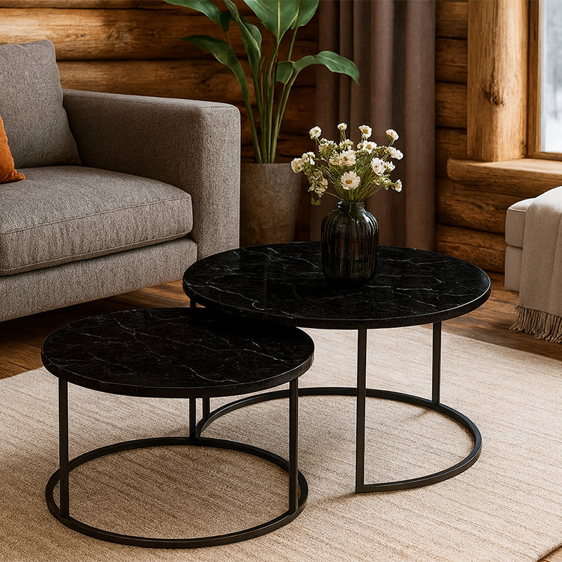 Αναβαθμίστε το σαλόνι σας με το πρακτικό και μοντέρνο σετ δύο ένθετων τραπεζιών σαλονιού Solme. Σχεδιασμένα για να φωλιάζουν το ένα κάτω από το άλλο, προσφέρουν ευελιξία, εξοικονόμηση χώρου και μια σύγχρονη αισθητική που συνδυάζει τη κομψότητα του μαρμάρου με τη δυναμική γραμμή του μαύρου μετάλλου.