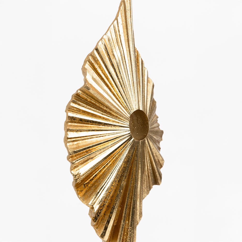 Το διακοσμητικό USSIA Totem εντυπωσιάζει με τη μοναδική του μορφή που θυμίζει φύλλο φοίνικα ή ηλιακή ακτίνα, σε χρυσό φινίρισμα με ανάγλυφες λεπτομέρειες. Η μαύρη βάση του προσθέτει κομψότητα και σταθερότητα, καθιστώντας το ιδανικό για να στολίσει κονσόλες, ράφια ή τραπεζάκια με μια αύρα πολυτέλειας και καλλιτεχνικής έκφρασης.
