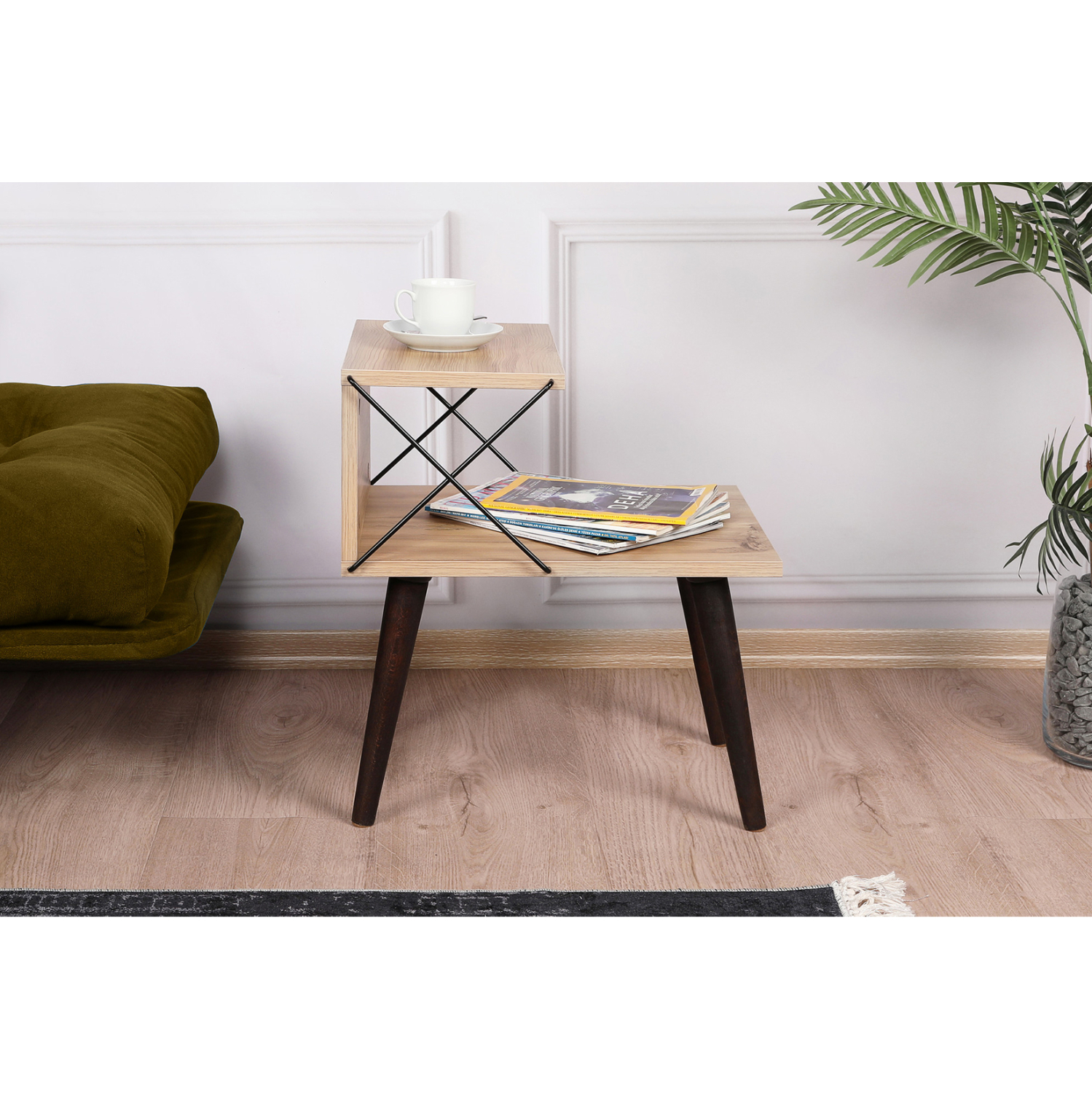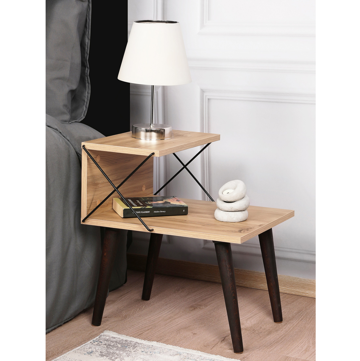 ΗΜ9434.01 ΒΟΗΘΗΤΙΚΟ τραπεζάκι/κομοδίνο—– Ανακάλυψε το ΗΜ9434.01 που θα αλλάξει την εικόνα του υπνοδωματίου σας ως κομοδίνο ή ως βοηθητικό στο σαλόνι σας. Δεν διαθέτει συρτάρι αλλά ανοιχτούς χώρους τοποθέτησης αντικειμένων, πράγμα που το κάνει ιδιαίτερα πρακτικό. Το φυσικό χρώμα ξύλου της μελαμίνης σε συνδυασμό με τις μαύρες μεταλλικές χιαστί βέργες που χρησιμεύουν και ως στηρίγματα της κατασκευής αλλά και τα μαύρα πόδια του κομοδίνου, δημιουργούν μια όμορφη διχρωμία που ταυτόχρονα φαντάζει «οικεία» σε όλους.