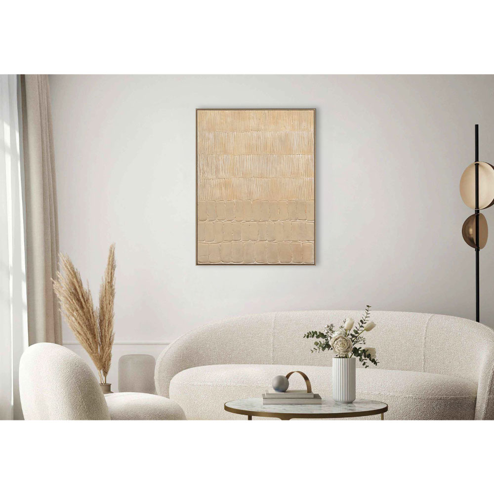 Ο πίνακας ZEB είναι ένας αφηρημένος πίνακας σε μπεζ και φυσικούς τόνους, με υφές που θυμίζουν χειροποίητη ύφανση. Το design του προσφέρει μια γήινη, ζεστή ατμόσφαιρα που ταιριάζει σε boho, neutral και μοντέρνες διακοσμήσεις. Ο καμβάς υψηλής αντοχής και η ξύλινη κορνίζα ενισχύουν τη σταθερότητα και την premium αισθητική. Ένα κομμάτι που προσθέτει ηρεμία και φυσική αρμονία στον χώρο.